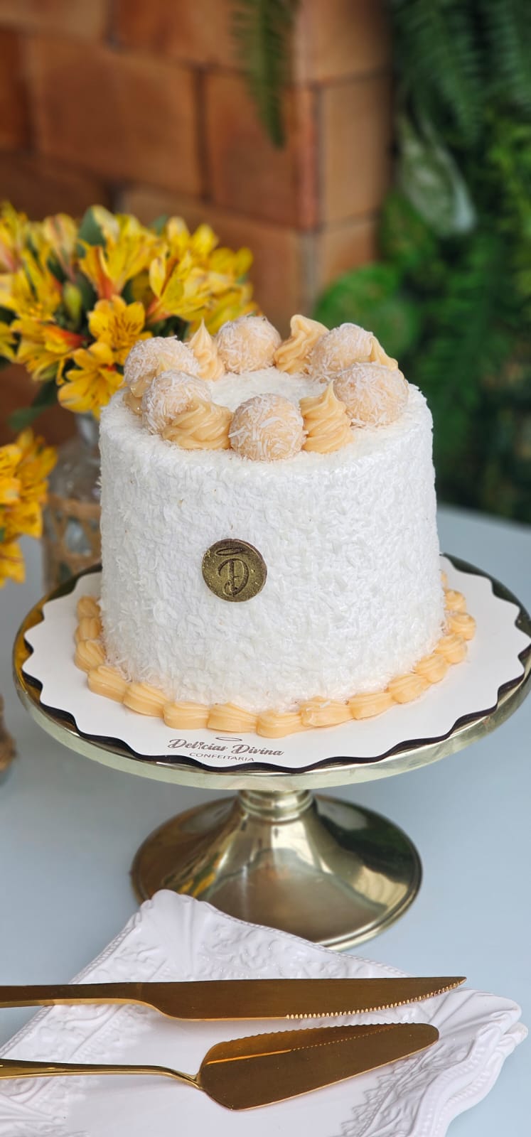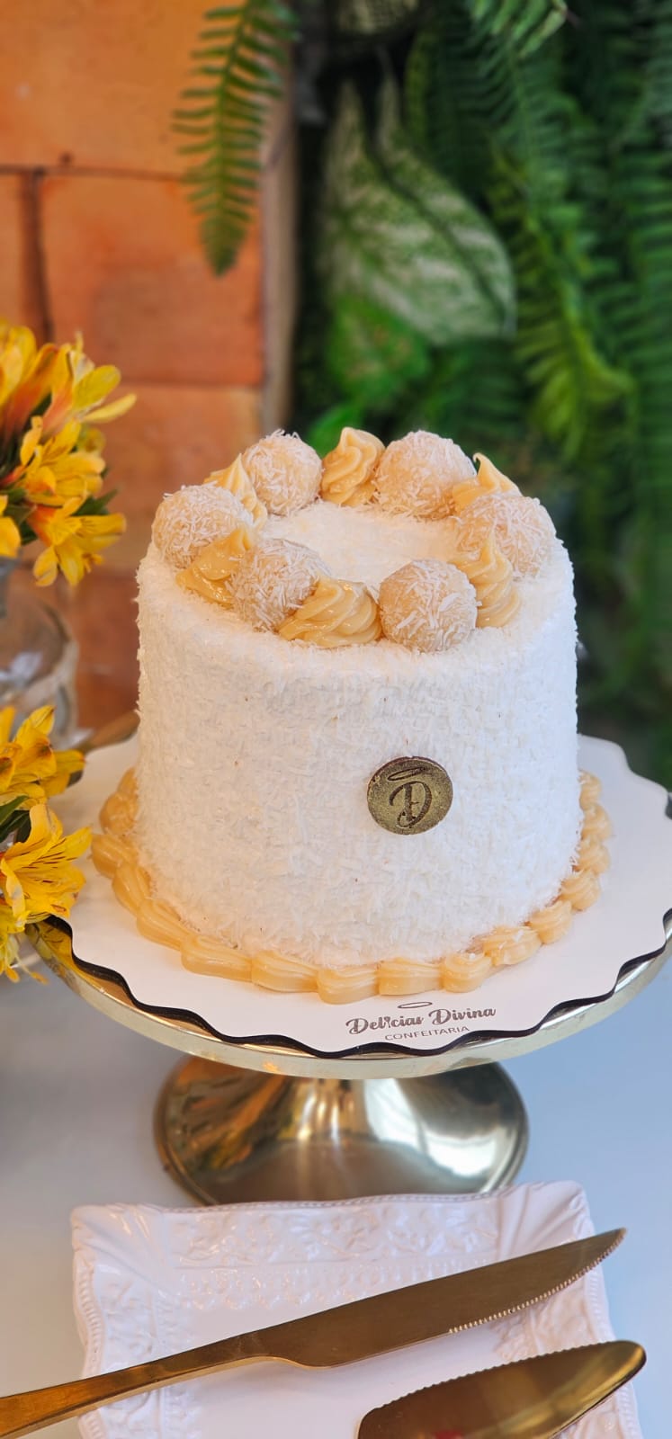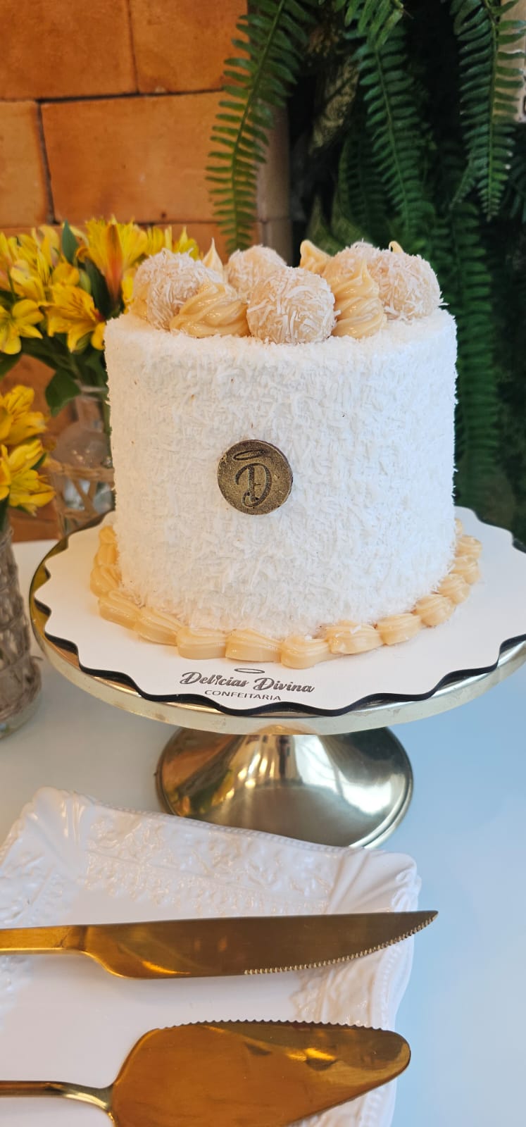 TORTA DE MASSA BRANCA, RECHEIO DE BEIJINHO, COBERTURA DE BRIGADEIRO BRANCO, FINALIZADA COM COCO E BEIJINHOS.
