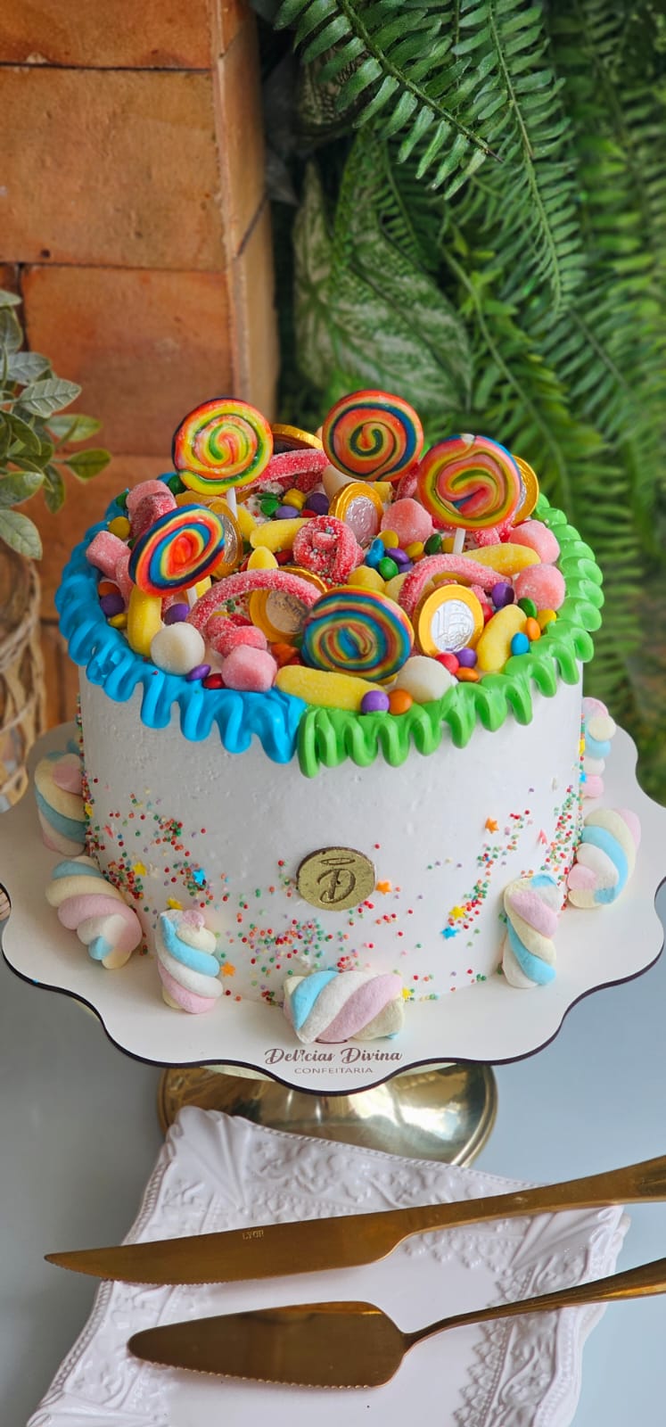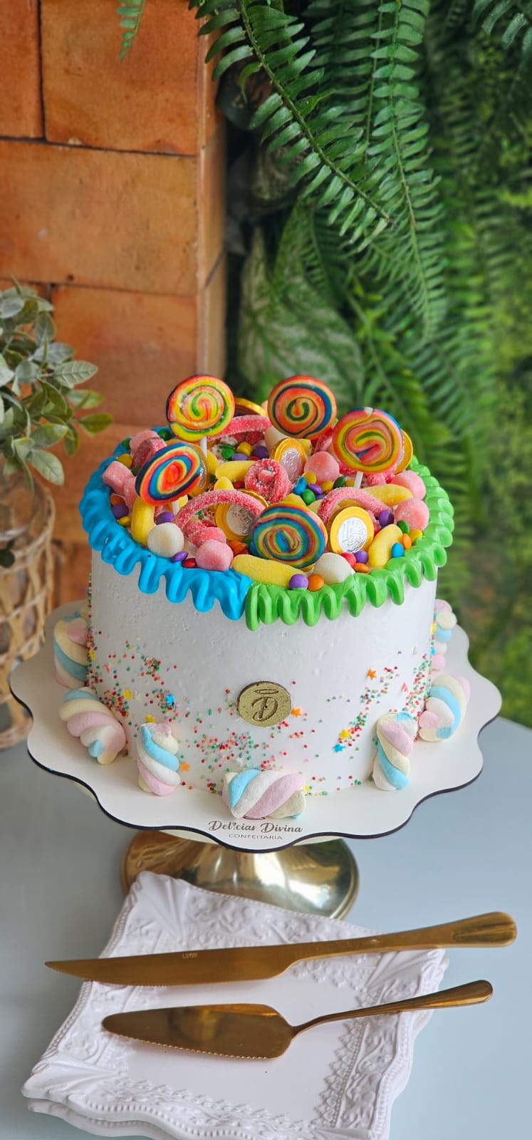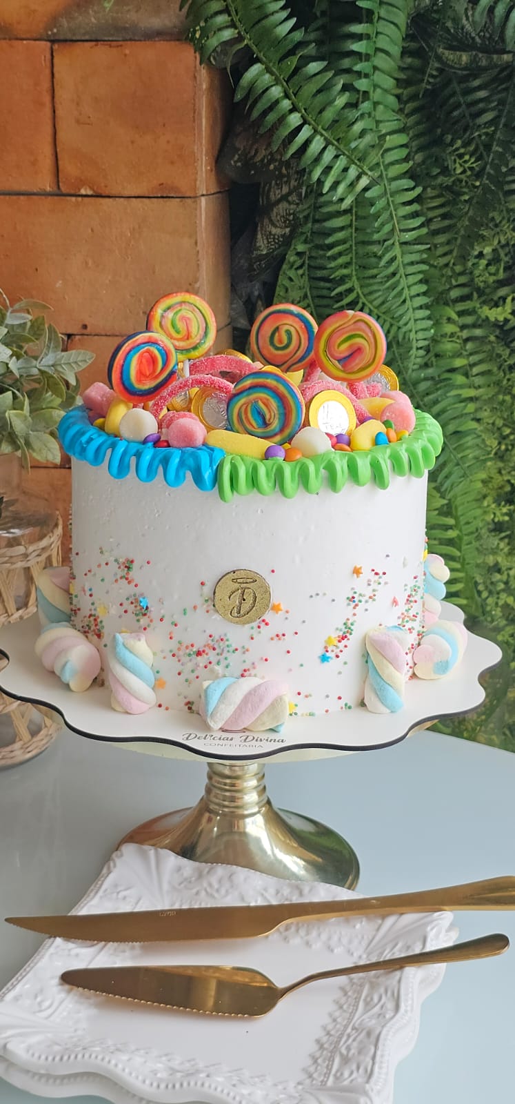 TORTA DE MASSA BRANCA, RECHEIO CHOCOLATE COBERTURA DE CHANTILLY, FINALIZADA COM BRIGADEIROS E GULOSEIMAS.