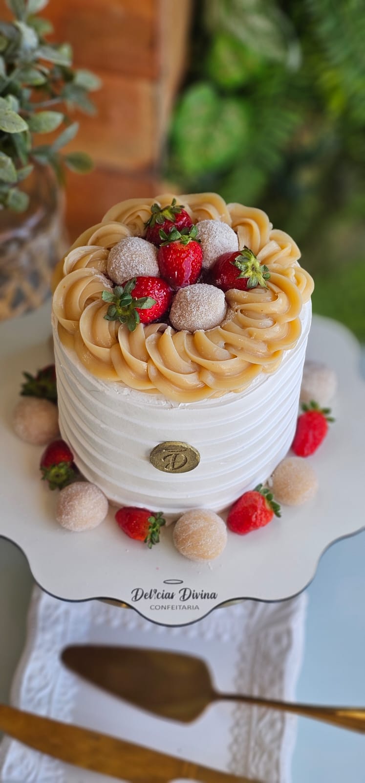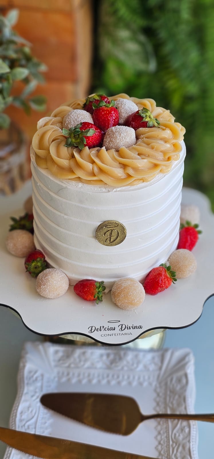TORTA DE MASSA BRANCA, RECHEIO DE BRIGADEIRO BRANCO COM GELEIA DE MORANGO COBERTURA DE CHANTILY, FINALIZADA COM CHANTILY E MORANGO.