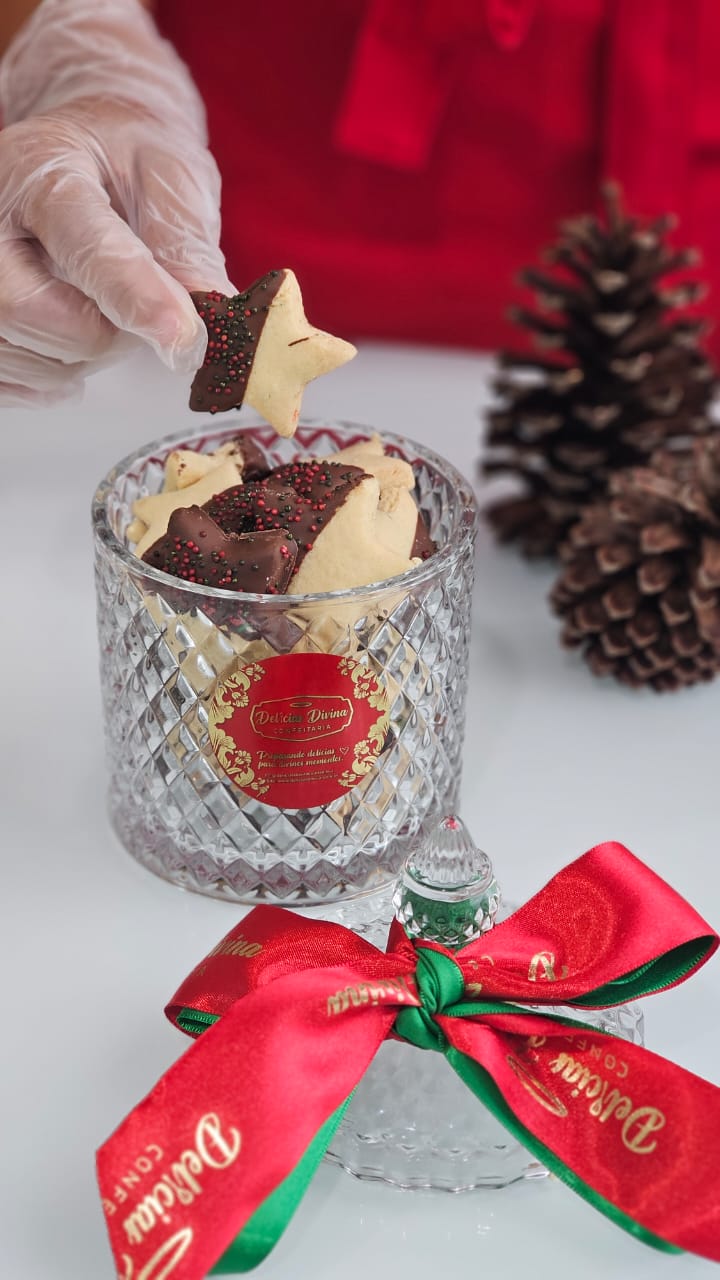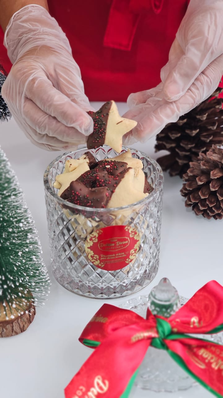 Obs: Os sequilhos são acoplados dentro do recipiente de vidro, o qual vai embalado de forma presenteava em sacola de papel tradicional da casa.
