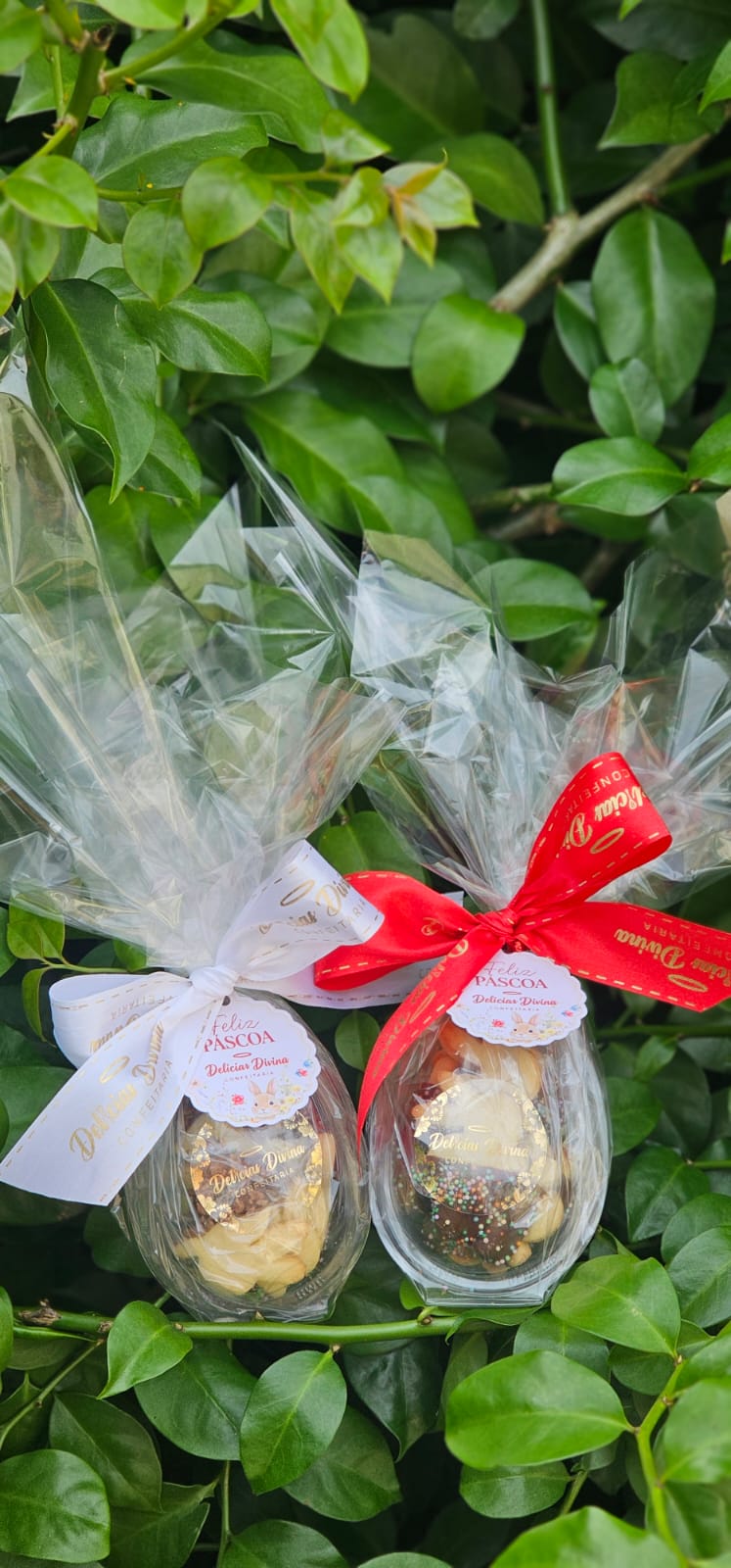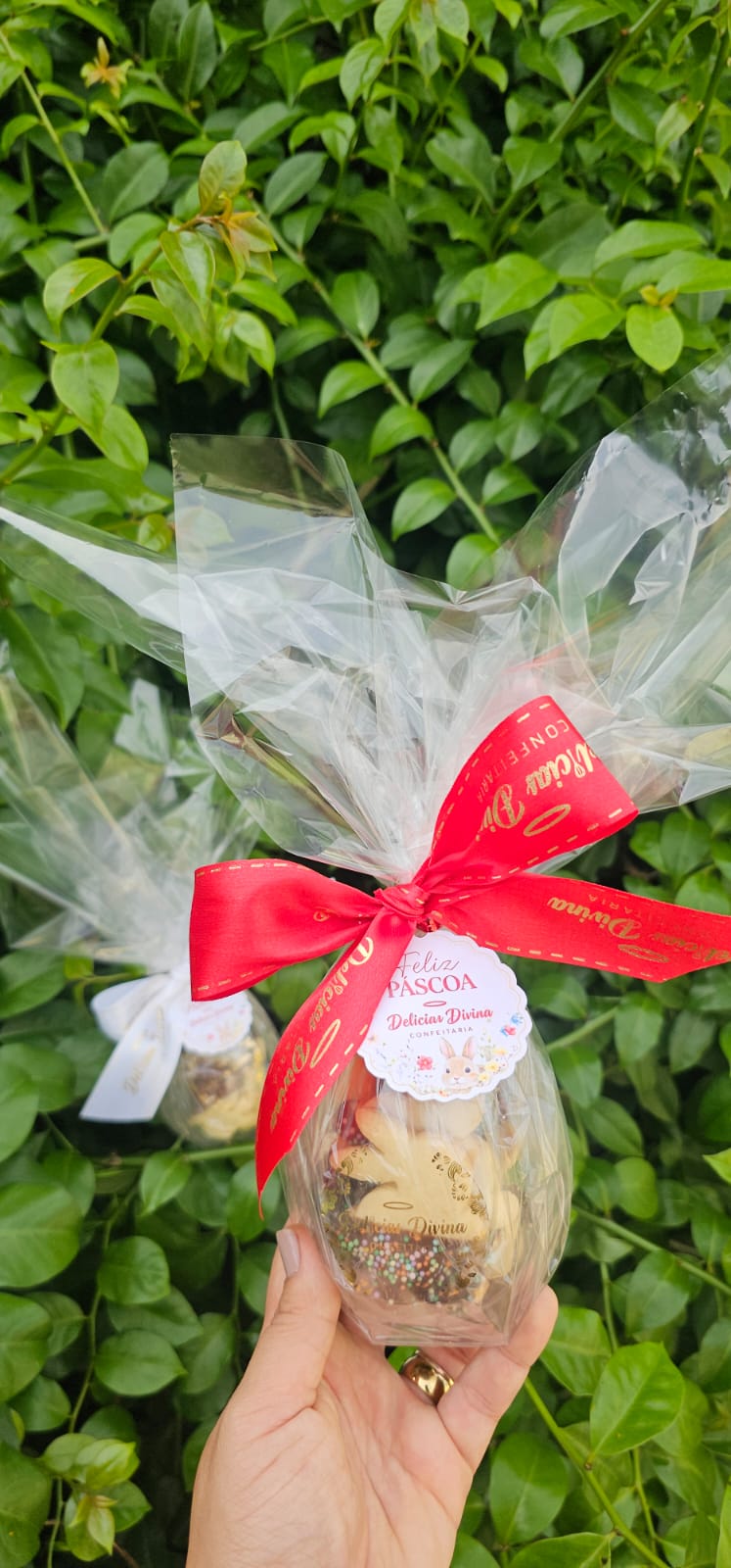 Sequilhos amanteigados, banhado em chocolate meia lua, embalado em formato de ovo de pascoa com laço e tag, ideal para presentear.